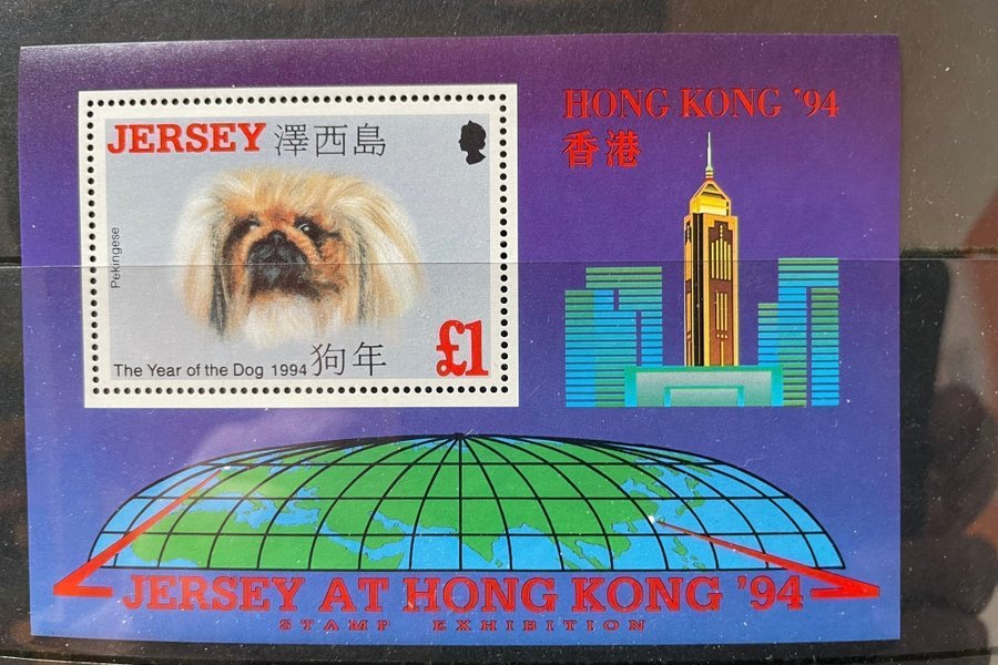 Postfriskt miniblock, utgivet i samband med frimärksutställningen 1994 i Hong kong. Motivet är en hund ( Pekingnese ).