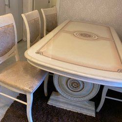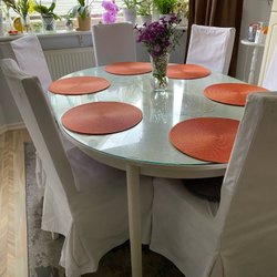 Et stilfuldt spisebord med træbordplade og hvide ben. Perfekt til middagsselskaber eller hverdagsbrug.