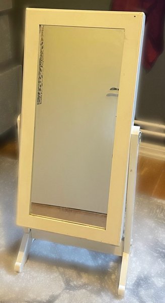 Vit bordspegel som kan vinklas. Passar bra på ett sminkbord eller i hallen.