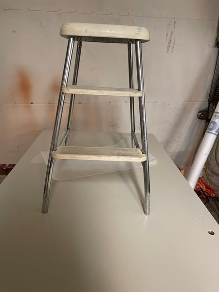 Pallen har en vit sits och tre vita steg. Ramen är i metall. Steg o sits är metallförstärkt.