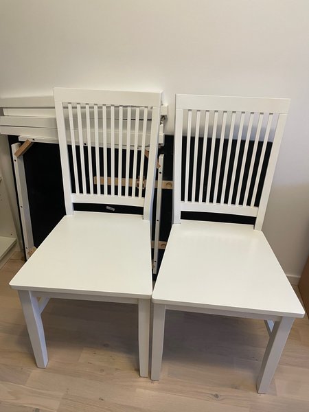 Två vita stolar med spjälad rygg. Passar bra i köket eller matsalen. Är Mios Ingrid