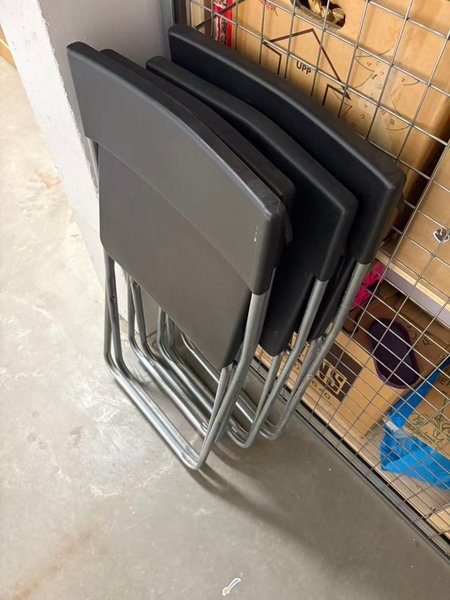Fällbara stolar i svart och metall. Praktiska för extra sittplatser och enkla att förvara.