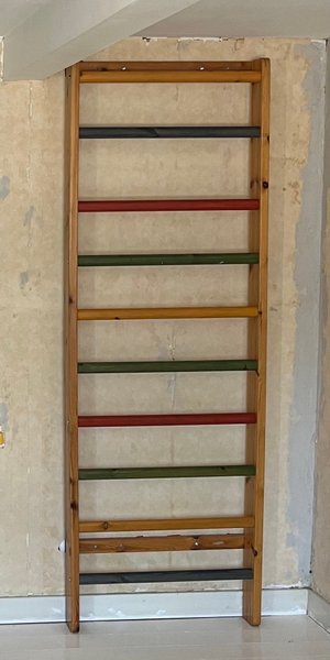 Ribbstol i trä med färgade ribbor. Ribborna är i färgerna svart, rött, grönt och gult.