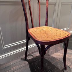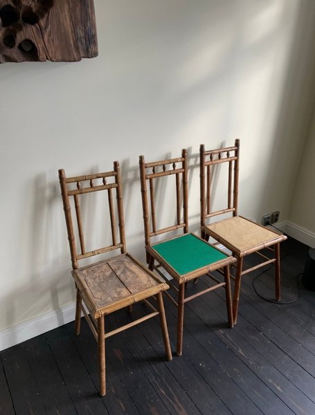 Tre retro bambustolar med olika sitsar. En stol har en sits i trä, en annan har en grön tygsits och den tredje har en sits i rotting.
