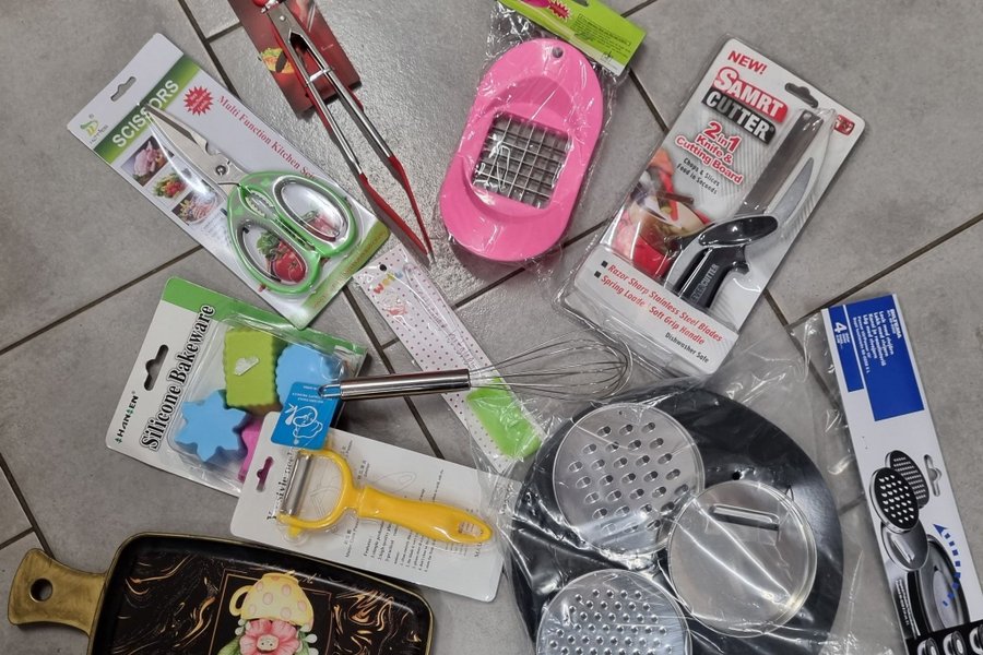 Säljer ett paket med olika köksprylar, perfekt för den som vill ha en komplett uppsättning. Paketet innehåller bland annat en grönsaksskärare, en peeler, en visp, en skärbräda, en uppsättning silikonformar och en uppsättning rivjärn.