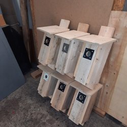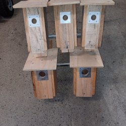 2 st öppningsbara starholkar med plåt runt hålet. Tak i plywood. Passar även t ex trädkrypare och nötväcka. Innermått ca 15x14 cm. Virkestjockleck ca 22 mm.