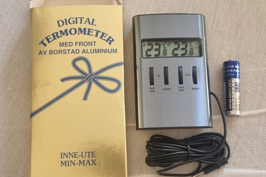 Digital termometer med front av borstad aluminium. Inne-ute min-max. Artikelnummer 02183. Batteri ingår.