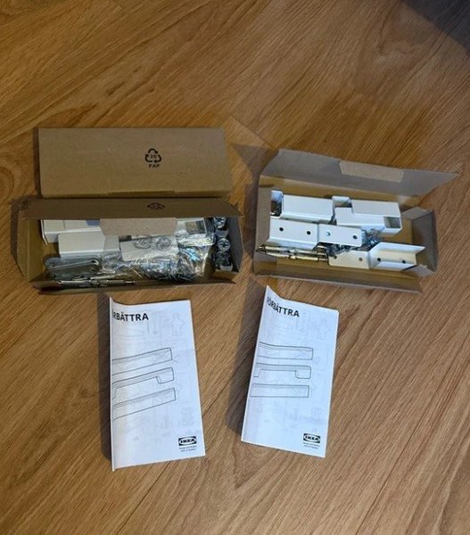 Säljer 3 st lådor med monteringstillbehör för IKEAs ”FÖRBÄTTRA” täcksockel. Div. Monteringsdetaljer som vinkeljärn, vinkelskruv, insatsmuttrar etc.