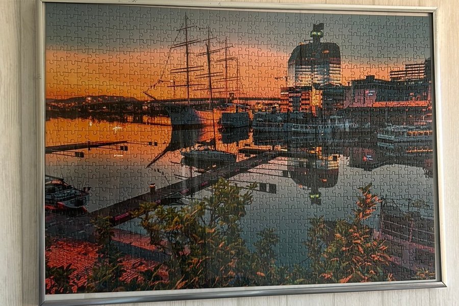 Pussel i silverfärgad ram. Motivet föreställer en hamnstad i solnedgång i Göteborg.