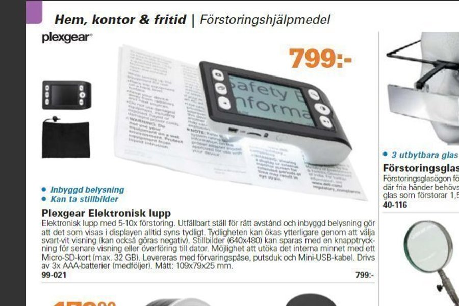 Elektronisk lupp med 5-10x förstoring. Utfallbart ställ för rätt avstånd och inbyggd belysning gör att det som visas i displayen alltid syns tydligt. Tydligheten kan ökas ytterligare genom att välja svart-vit visning (kan också göras negativ). Stillbilder (640x480) kan sparas med en knapptryckning för senare visning eller överföring till dator. Möjlighet att utöka det interna minnet med ett Micro-SD-kort (max. 32 GB). Levereras med Mini-USB-kabel. Drivs av 3x AAA-batterier. Mått: 109x79x25 mm.