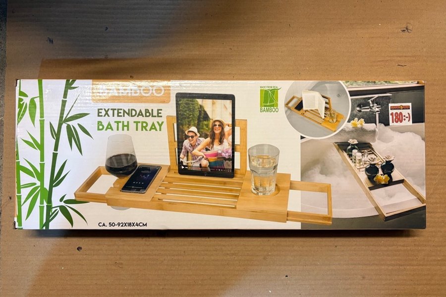 Denna utdragbara badkarsbricka i bambu är designad för att hålla din surfplatta, telefon och dryck. Måtten är 50-92x18x4 cm.