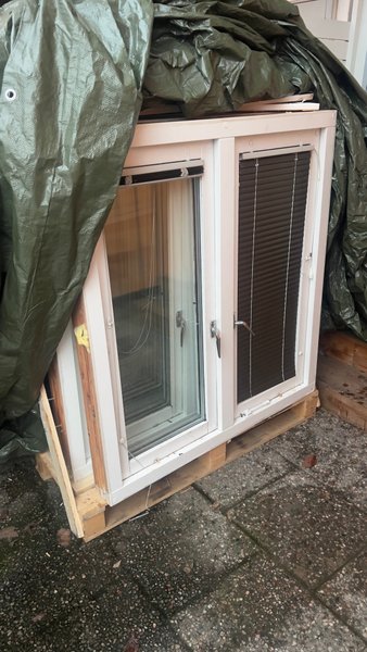 Fönster med dubbelglas och integrerade persienner. Fönstret har vita ramar och handtag i metall. Bredd 110cm höjd 120cm.