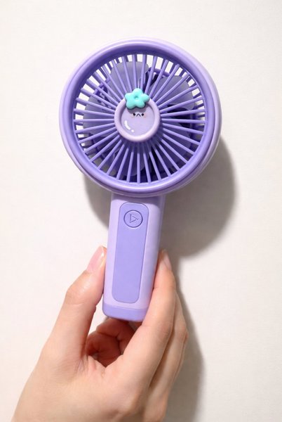 Denna bärbara handhållna fläkt är lila och har en söt design med ett ansikte och en blomma i mitten av fläktgallret. Den är kompakt och lätt att bära med sig.