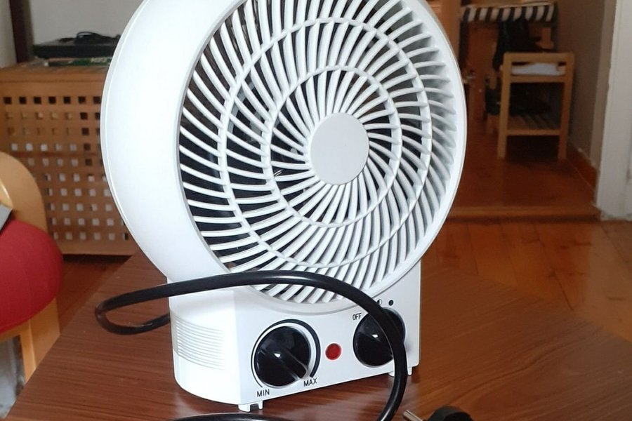 En vit elektrisk fläkt. Den har inställningar för min och max, samt en avstängningsknapp. B 25 H20 D10. Har även ren fläkt. Som ny.