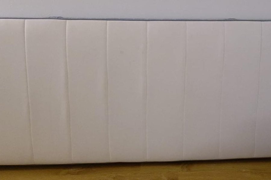 Matras met een gestoffeerde bovenkant en een grijze rand. Het matras heeft verticale stiksels.