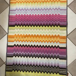 Liten vit matta med blå/grå dekor. Enl.bilder.