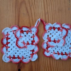 Två handvirkade grytlappar i gult o brunt