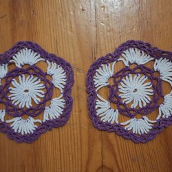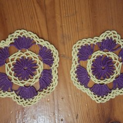 Två handvirkade grytlappar i gult o brunt. De är ca 15 cm x 15 cm. De är i bomull. De är oanvända.