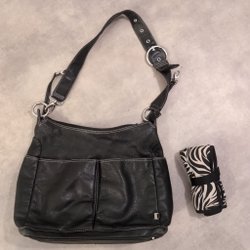 Svart skötväska med justerbar axelrem och bärhandtag, vattentåligt material. Väskan har ett stort fack med dragkedja (obs dragkedjan är trasig och behöver bytas) samt flera mindre fack inuti för förvaring. En fick med dragkedja invändigt och två termosfack på sidorna