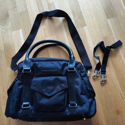 Säljer en fin svart skötväska från Elodie Details. Väskan har flera fack för att organisera blöjor, flaskor och andra nödvändigheter. Den har både handtag och en justerbar axelrem.