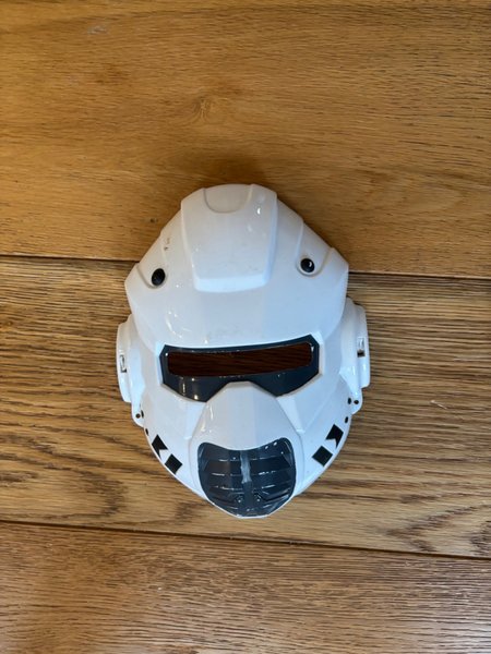 Vit robotmask med svarta detaljer. Masken har en mörkare visir och är designad med futuristiska linjer.