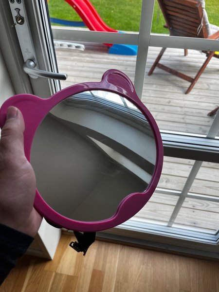 Söt babyspegel i rosa färg, perfekt för bilen. Den har en justerbar rem för enkel montering.