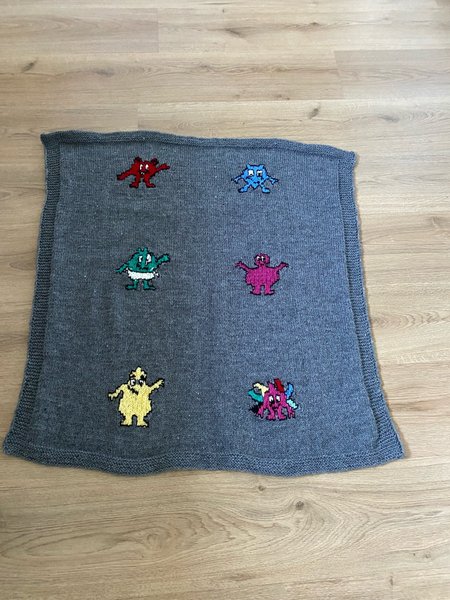 Barn filt hemstickad med babblarna. Stickad i akryl tvättas i maskin 40grader utan sköljmedel. 91x87cm