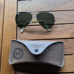 Ett par klassiska Ray-Ban Aviator solglasögon. Perfekt för soliga dagar och ger en tidlös stil.