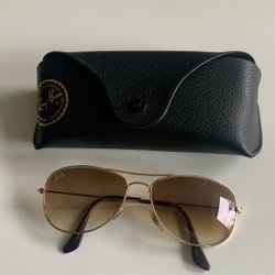 Säljer ett par klassiska Ray-Ban Aviator solglasögon. De har en tidlös design med guldram och bruna glas. Perfekt för att skydda ögonen med stil. Ett originalfodral medföljer.