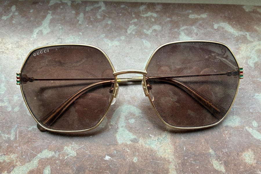 Ett par Gucci solglasögon med guldfärgad ram och bruna glas. Modellen har de klassiska Gucci-detaljerna i rött och grönt.