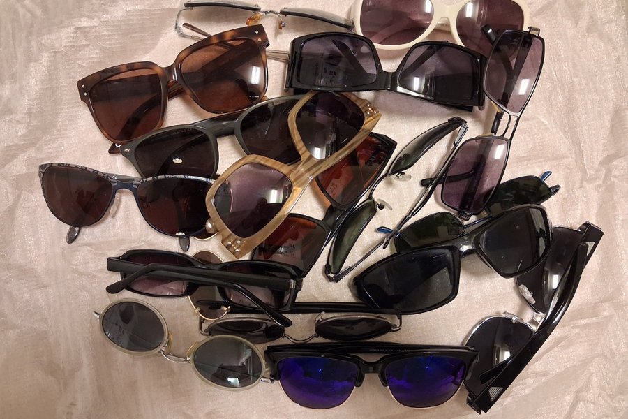 Ett parti med solglasögon i olika modeller och färger. Innehåller bågar i plast och metall, med linser i olika nyanser.