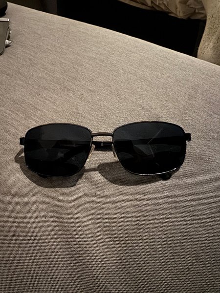 Svarta solglasögon med mörka linser och en tunn metallbåge. Passar för soliga dagar.