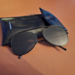 Solglasögon från Acne Studios i brun nyans. Modellen har en fyrkantig form och mörka linser. Dem är lite repiga men är fortfarande fina och det är inget som förstör helhetsbilden. Passa på kostade flera tusen.