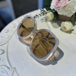 Ett par solglasögon med en ljus båge och detaljer i brunt mönster. Glasen har en brun nyans. Köparen betalar frakten. Helst omgående betalning.