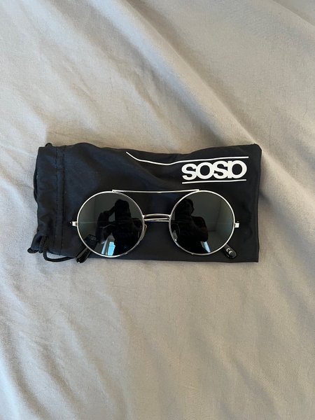 Solglasögon från ASOS med runda, mörka glas och silverfärgade bågar. Levereras med en svart tygpåse med ASOS-logotyp.