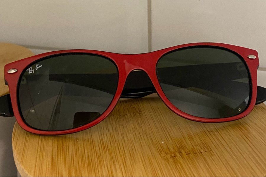 Ray-Ban Wayfarer solglasögon i rött. Klassisk modell med svarta linser och Ray-Ban logotyp på skalmen. Passar för både dam och herr. Fodral finns. Jag ansvarar inte för postens hantering. Bet inom 3 dagar