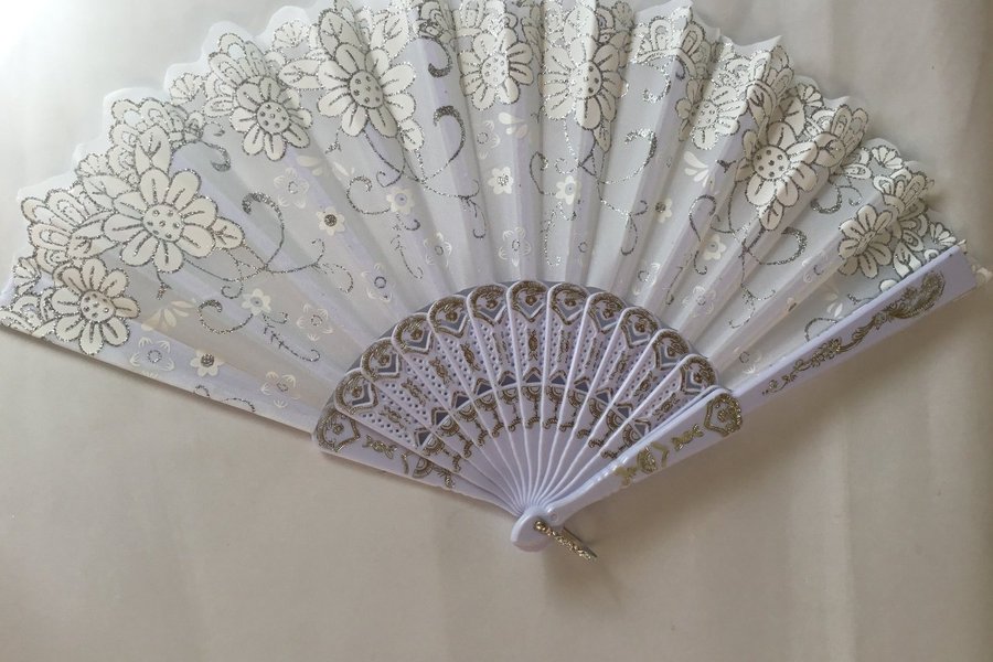 Solfjäder i Tyg med vit och silvermönster