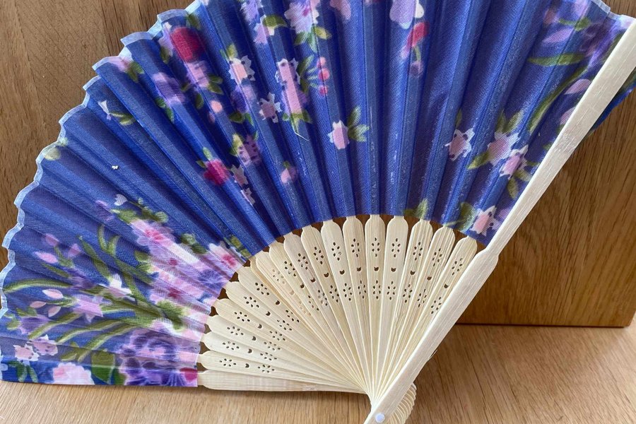 Solfjäder i trä med mönstrat tyg