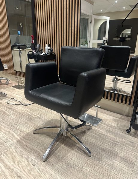 Frisörstol i svart konstläder med förkromad fot. Stolen har en hydraulisk pump för höjdjustering och kan roteras 360 grader. Armstöden är integrerade i designen.