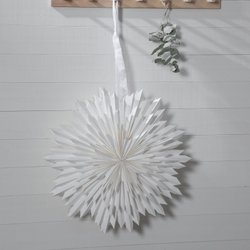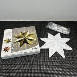 Elegant vit pappersstjärna på fot med dekorativt rött band. En stilren och klassisk juldekoration som sprider ett varmt och stämningsfullt ljus i hemmet.