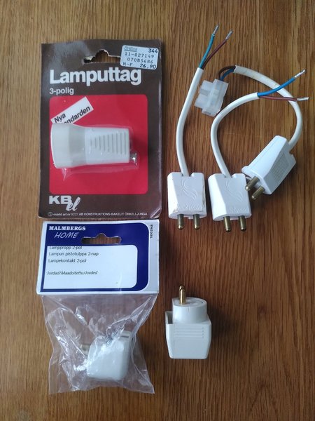 Diverse lampproppar och lamputtag. Inkluderar en 3-polig lamputtag från KBE, 2-poliga jordafe lampproppar från Malmbergs Home, och andra lampproppar med kabel samt 1 sockerbit.