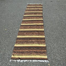 En retro plastmatta med ett geometriskt mönster i gröna och blå toner. Mattan har fransar på kortsidorna.
