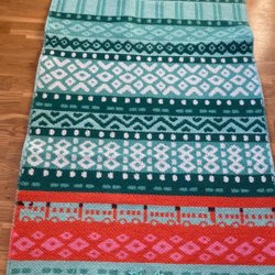 En handvävd trasmatta i fina färger. Mattan har ränder i nyanser av orange/grått/vitt och lila