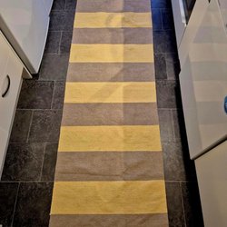En trasmatta med blå detaljer. Mått: 94 cm x 189 cm.