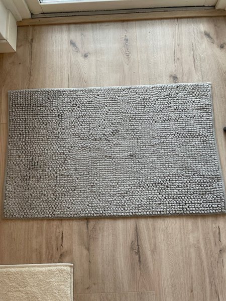 En grå badrumsmatta. Perfekt för att addera komfort och stil till ditt badrum.