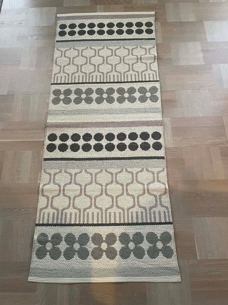 174x 69cm. Den har olika geometriska former och blommönster i gråa och vita toner.