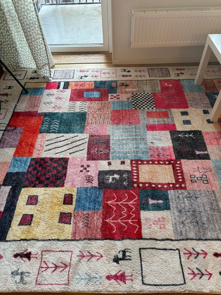 En färgglad matta som kan liva upp vilket rum som helst. Mattan har ett unikt mönster med olika färgade rutor och symboler.