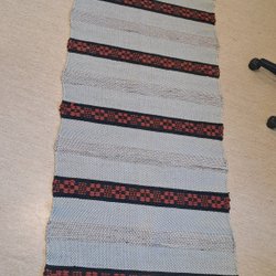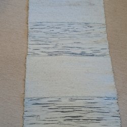 Trivsam randig trasmatta i ljusblått och krämvitt från Søstrene Grenes. 100 procent bomull. Mäter cirka 60x92 cm.