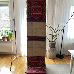 En orientalisk matta med ett distinkt mönster. Mattan har en rektangulär form och är prydd med olika motiv i rött, beige och mörkblått.