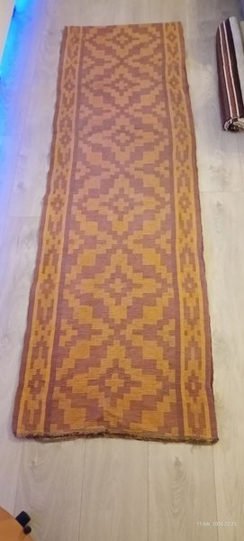 Långsmal handvävd matta på 425cm med ett geometriskt mönster. Mönstret är i toner av brunt och gult.